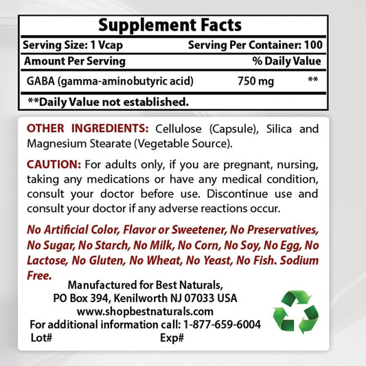 Best Naturals Gaba 750 mg 100 Veggie Caps