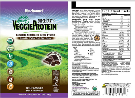 Bluebonnet Nutrition Super Earth Organic Veggie Protein Powder, Soy Free, Gluten Free, Kosher, Non-GMO, Vegan, USDA Organic, No Sugar Added, Chocolate Mocha Flavor, 1 lb, 15 Servings