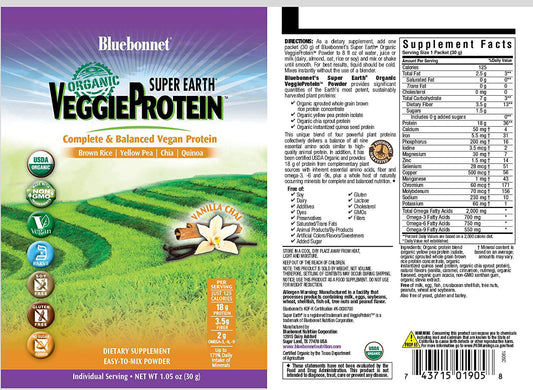 Bluebonnet Super Earth Veggie Protein Powder Original, Vanilla Chai, 1.05 oz ,8 Count