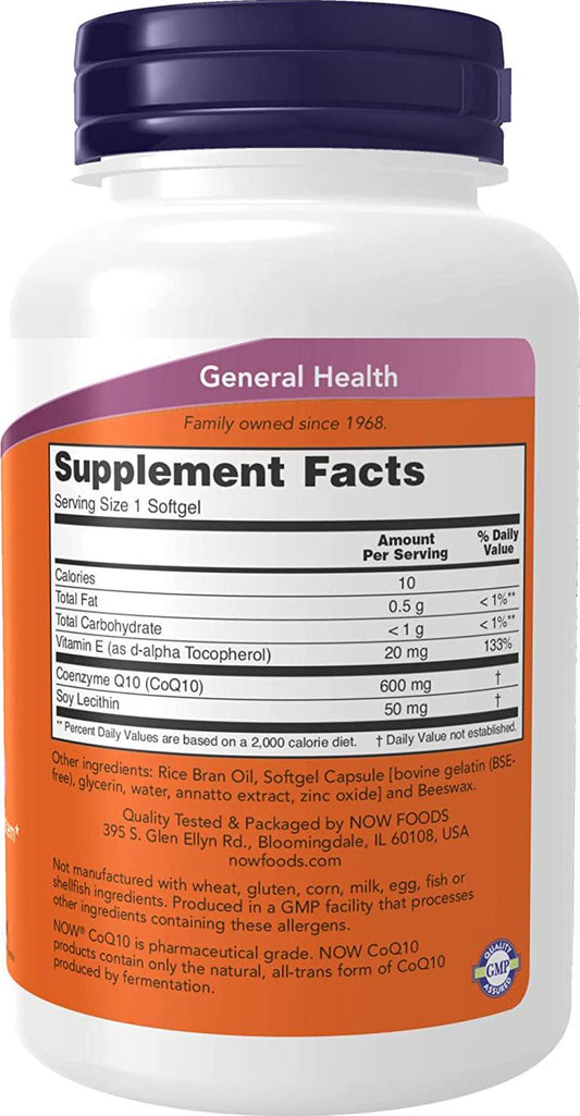 NOW Supplements, CoQ10 600 mg, Maximum Strength with Vitamin E and Lecithin, 60 Softgels