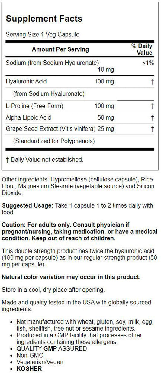 NOW Supplements, Hyaluronic Acid 100 Mg, Double Strength with L-Proline, Alpha Lipoic Acid and Grape Seed Extract, 120 Veg Capsules