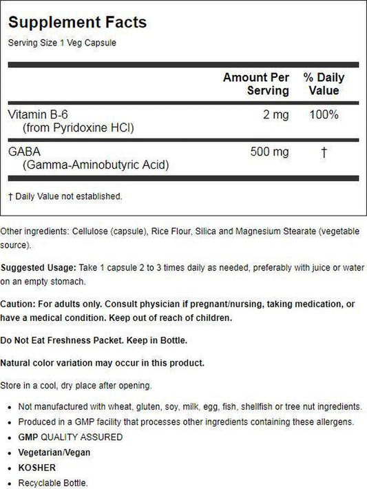 Now Supplements, GABA (Gamma-Aminobutyric Acid)500 mg + B-6, 100 Count, Veg Capsules
