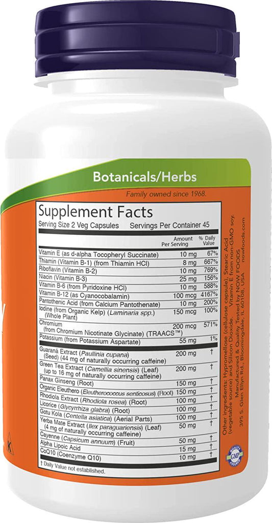 NOW Supplements, Energy Dietary Supplement (lncludes B Vitamins, Green tea, Panax Ginseng and Rhodiola), 90 Capsules