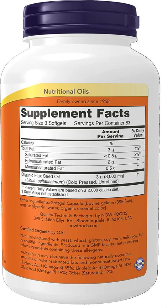NOW Supplements, Flax Oil 1,000 mg made with Organic Flax Oil, Cardiovascular Support*, 250 Softgels
