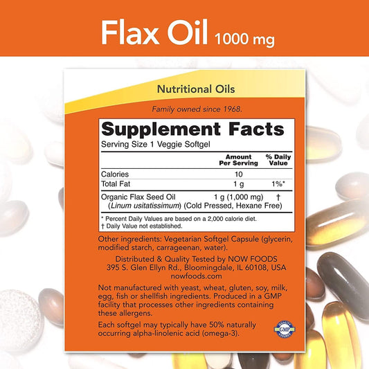 NOW Supplements, Flax Oil 1000 mg with Essential Omega-3s, Cold Pressed, Hexane Free, Vegan Formula, 120 Veg Softgels