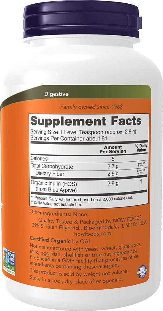 NOW Supplements, Inulin Prebiotic Pure Powder, Certified Organic, Non-GMO Project Verified, Intestinal Support*, 8-Ounce