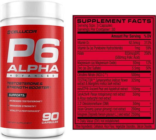 Cellucor P6 Alpha Advanced Testosterone and Strength Booster for Men - Boost Muscle Growth and Strength | Natural Test Booster w/TESTFACTOR, Ginseng, elevATP, DIM, SenActiv and Fenugreek - 90 Veggie Caps