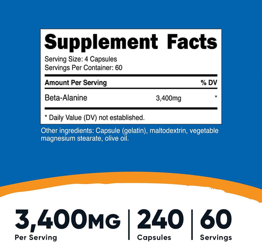 Nutricost Beta-Alanine Capsules 3400mg, 240 Capsules (60 Serv) - Potent Beta Alanine, Gluten Free and Non-GMO, 850mg Per Cap
