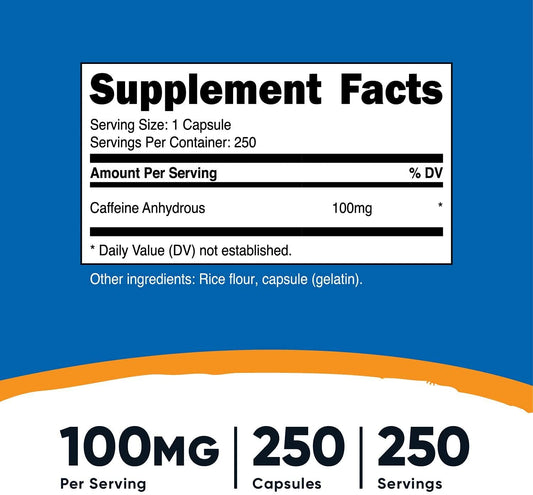 Nutricost Caffeine Pills 100mg Per Serving, 250 Capsules