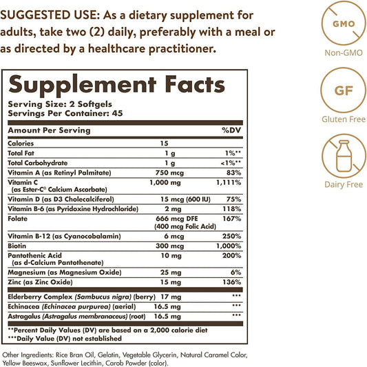 Solgar Ester-C Plus Immune Complex, 24-Hour Immune Support, Supports Upper Respiratory Health - Plus D3, Zinc, Elderberry and Echinacea - Non-GMO, Gluten Free, Dairy Free - 45 Servings, 90 Softgels