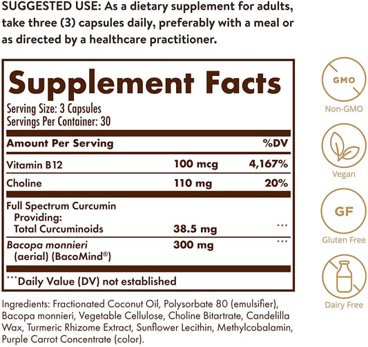 Solgar Full Spectrum Curcumin Brain Works, 90 Licaps - Support Memory Recall, Focus, Cognitive Function - Antioxidant Support - Curcumin, BacoMind, Choline, Vitamin B12 - Non-GMO, Vegan - 30 Servings