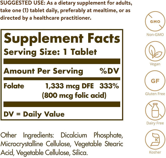 Solgar Folate 1,333 MCG Dietary Folate Equivalent (800 mcg Folic Acid), 250 Tablets - Heart Health, Healthy Nervous System, Prenatal Support - Non-GMO, Vegan, Gluten Free, Dairy Free - 250 Servings