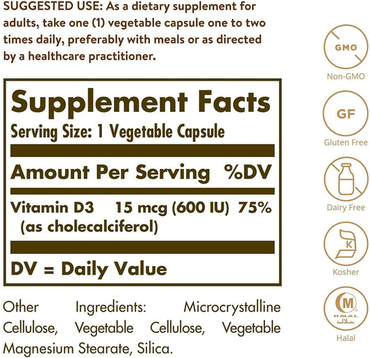Solgar - Vitamin D3 (Cholecalciferol) 600 IU Vegetable Capsules 120 Count