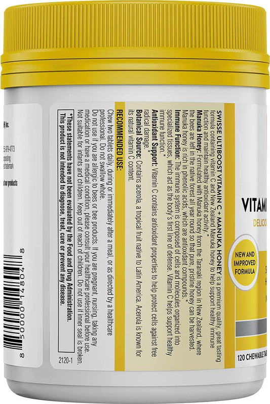 Swisse Ultiboost Vitamin C with Manuka Honey | Immunity Support, Rich in Antioxidants | 120 Chewable Tablets