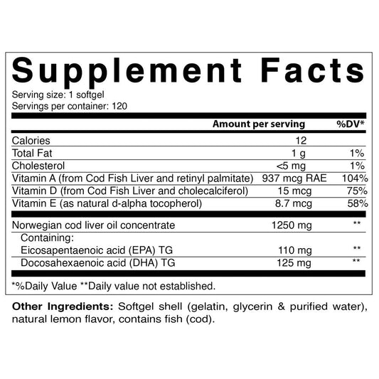 Vitamatic Norwegian Cod Liver Oil 1250mg 120 Softgels (Lemon Flavor) - Promotes Cardiovascular Health