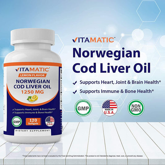 Vitamatic Norwegian Cod Liver Oil 1250Mg 120 Softgels (Lemon Flavor) - Promotes Cardiovascular Health