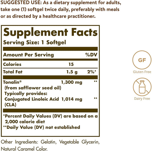 Solgar Tonalin CLA 1300 mg, 60 Softgels - Essential Omega-6 Fatty Acid - Derived from Non-GMO Safflower Seed Oil - Gluten Free, Dairy Free - 60 Servings