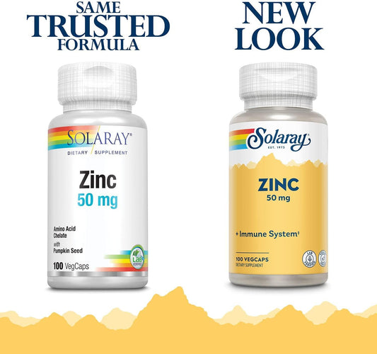 Solaray Zinc 50 mg Amino Acid Chelate with Pumpkin Seed, Immune and Cellular Health Support, Bioavailable, 100 VegCaps