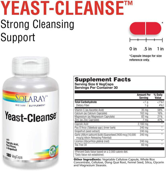 Solaray Yeast-Cleanse | with Caprylic Acid, PAU Darco, Grapefruit Seed Extract and Tea Tree Oil | Healthy Cleansing Support | 30 Servings | 180 VegCaps
