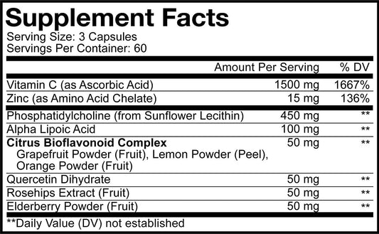 Liposomal Vitamin C 1500mg with Zinc, Elderberry, Citrus Bioflavonoids Grapefruit, Lemon, Orange Powder, Quercetin and Rose Hips Fruit – Natural Vegan Supplement - Non-GMO, Vegan Pills, 180 Capsules