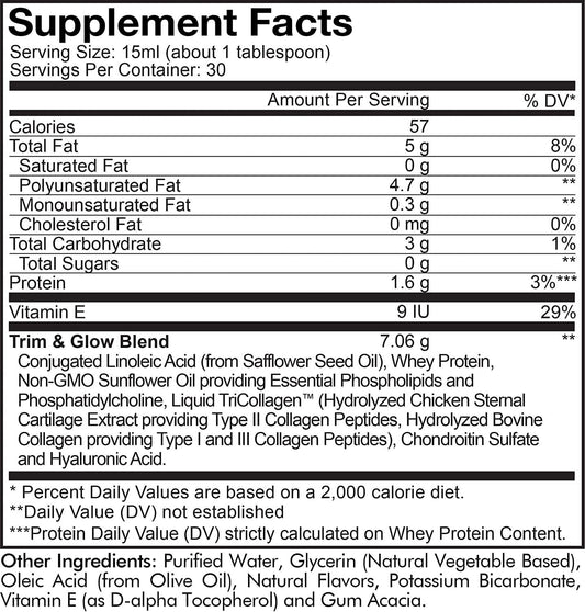 Nanofood Liposomal Trim and Glow, CLA Conjugated Linoleic Acid + Hyaluronic Acid, TriCollagen Liquid Supplement Vanilla Flavor, Hydrolyzed Peptides, Vitamin E, Chondroitin and Whey Protein, 15.22 fl oz