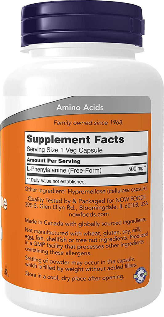NOW Nahrungsergänzungsmittel, L-Phenylalanin 500 mg, Unterstützung des Nervensystems*, Aminosäure, 120 pflanzliche Kapseln