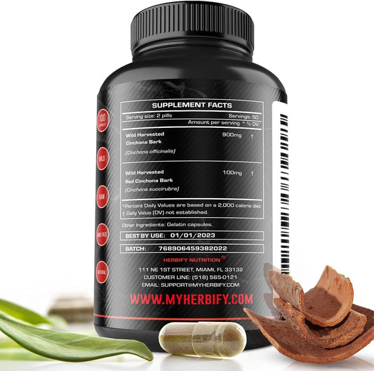 Quinine Pills 1000mg, Red Cinchona Bark (Cinchona succirubra) and Peruvian Bark (Cinchona officinalis) Powerful Combination, Wild Harvested Herbal Supplement, 100 Capsules (100)