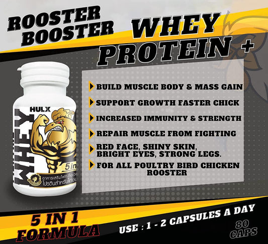 HULX 80 Capsule, Rooster Booster WHEY PLUS Vitamins Health Chicken Supplement Build and Repair Muscle Body and Mass Gain Chick Bird Poultry Super Increasing Power Formula, Cock Fighting Gamecocks Hen Food