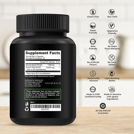 Sulforaphane Supplement 10000 mcg (Made in The USA) Third Party Tested Sulforaphane Supports Cellular Optimization and Cognitive Function, Broccoli Sprout Supplement, Broccoli Sprout Extract, HumanX