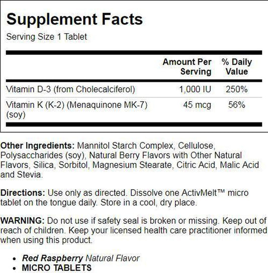 KAL D-3 and K-2 Activmelt | Healthy Bones, Heart & Immune Function Support | Instant Dissolve Tabs | Natural Red Raspberry Flavor | 60 Micro Tablets