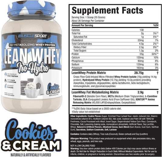 MuscleSport Lean Whey Revolution , Whey Protein Isolate with Hydrolyzed Whey - Low Calorie, Low Carb, Low Fat, Incredible Flavors - 25g Protein per Scoop (2lb, Cookies N Cream)