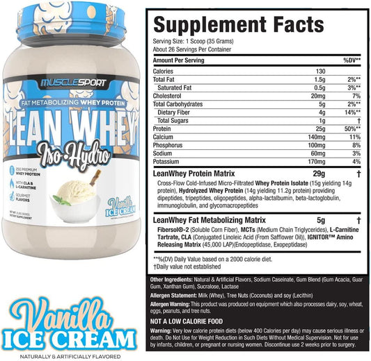 MuscleSport Lean Whey Revolution Protein Powder - Whey Protein Isolate - Low Calorie, Low Carb, Low Fat, Incredible Flavors - 25g Protein per Scoop (2LB, Vanilla Ice Cream)