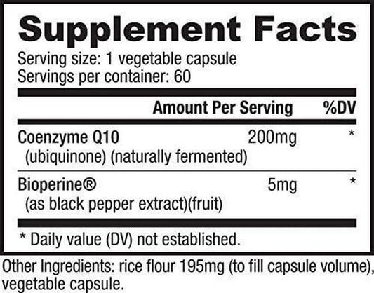 NutraBio CoQ10 Dietary Supplement with Bioperine (60 Capsules, 200mg)