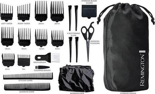 Remington High Precision Haircut Kit, HC1091AU, Corded, 23-Piece Pack Includes: Hair Clipper With Taper Lever, 10x Comb guides (3-25MM), Scissors, Styling Combs, and Sectioning Clips - Silver