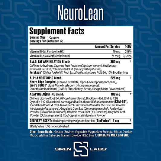 Siren Labs Neuro Lean Concentrated Thermogenic for Health, Water Loss, Energy and Focus - 60 Capsules