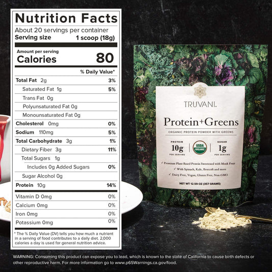 Truvani Protein + Greens | Organic, Non-GMO, Vegan, Gluten Free, Dairy Free | Daily Greens Combined with Protein | Great Taste with a Splash of Sweetness