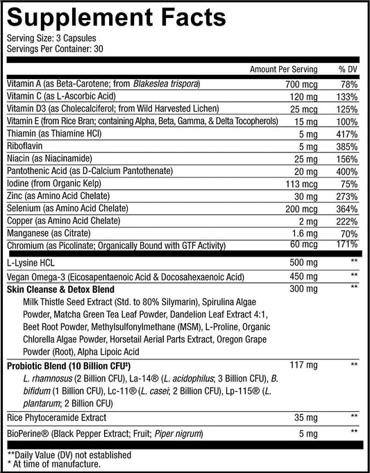 Clearface Pantothenic Acid, Niacin Supplement, Vitamins A, C, D3, E, FloraFIT Probiotics, Zinc, Riboflavin, Thiamin, L-Lysine HCL and Omega-3, Niacinamide, Skin Botanical Blend - Non-GMO - 90 Capsules