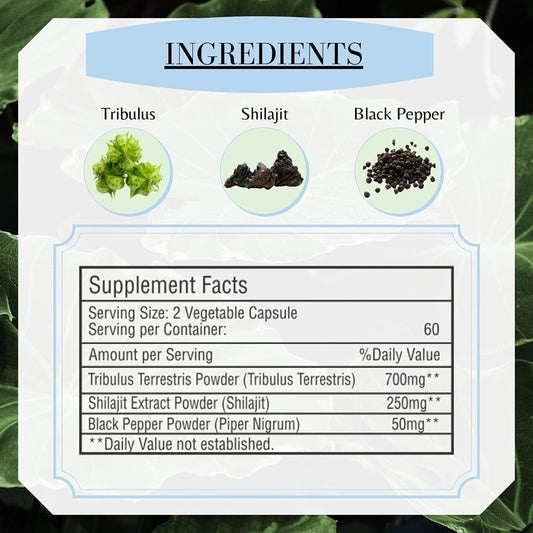 Tribulus Terrestris Capsules, Enhanced with Shilajit| 1000* mg, 120 Vegan Capsules| Testosterone Booster| Stamina Booster | Vegan , Gluten Free