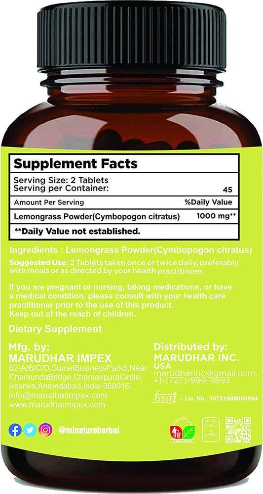 Lemongrass Tablets by mi Nature | 90 Tablets, 1000 mg | 45 Days Supply | Cymbopogon citratus | Promotes Digestion | Detoxification |Vegan