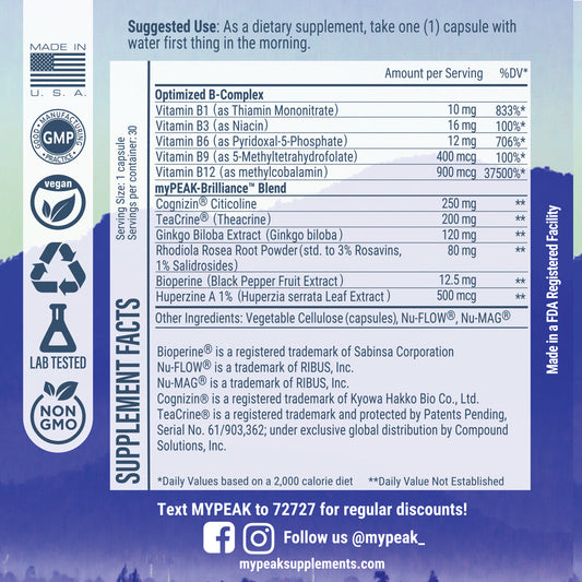 Mypeak Brilliance: Nootropic Focus Supplement for 8-Hours of Sustained Energy, Reduce Fatigue, Enhance Focus, Improve Memory, Caffeine-Free Pre-Workout with Theacrine, Theanine, Gingko, B-Complex