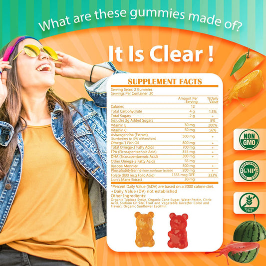 Omega 3, Phosphatidylserine, Bacopa Monnieri, Ashwagandha Gummies - Brain Booster, Immune Support - Brain Support Supplement for Focus, Memory, Concentration, 120 Gummies