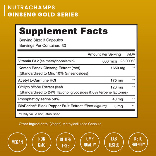 Nutrachamps Korean Red Panax Ginseng [Gold Series] Double Strength Root Extract 10% Ginsenosides Energy & Focus Pills with Ginkgo Biloba, Vitamin B12, Acetyl L-Carnitine & Bioperine - Vegan Capsules