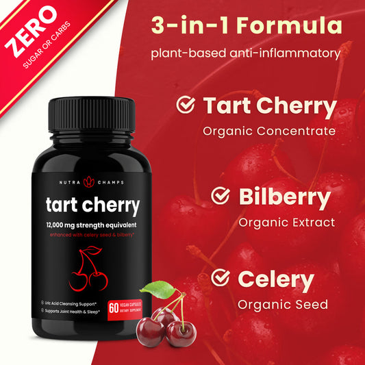 Nutrachamps Organic Tart Cherry Extract Capsules | Tart Cherry Supplement with Bilberry Fruit & Celery Seed | 1200Mg Premium Uric Acid Cleanse for Joint Support & Muscle Recovery | 60 Vegan Capsules
