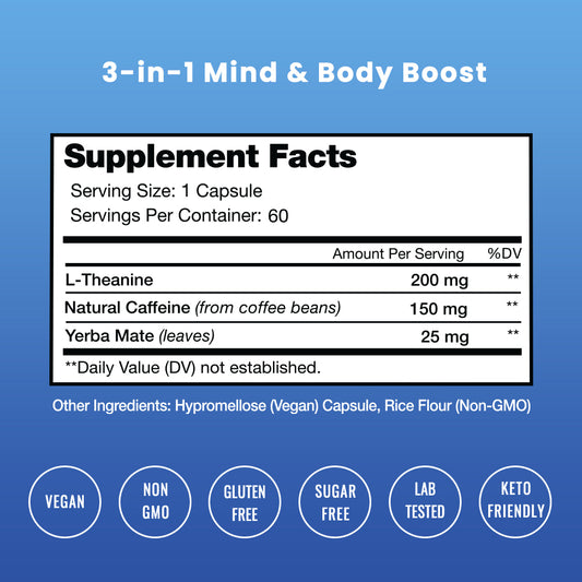 Nutrachamps Caffeine Pills with L-Theanine for Focused Energy | Smooth & Clean Energy Supplement for Focus & Performance | No Crash, No Jitters | Nootropic Brain Booster with Yerba Mate | 60 Capsules
