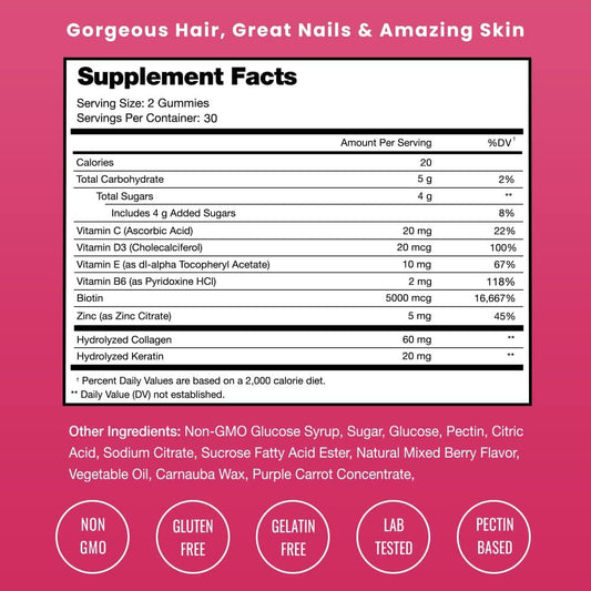Hair Skin and Nails Gummies with Biotin | Premium Hair Growth Vitamins with Keratin and Collagen Gummies for Nail Growth | Biotin Gummies with Essential Hair and Nails Vitamins for Women and Men (2-Pack)