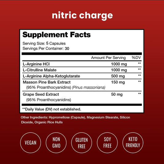 Nitric Oxide Supplement with L Arginine, Citrulline Malate, AAKG, Pine Bark and Grape Seed Extract - NO Booster for Muscle Growth, Strength, Vascularity, Energy and Blood Flow, Vegan Capsules