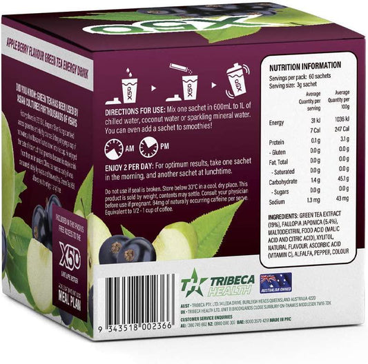 Green Tea X50 Green Tea and Resveratrol Apple Berry Energy Drink 60 Sachets, Energy, Antioxidants, Fat Burner,, Apple Berry 180 grams