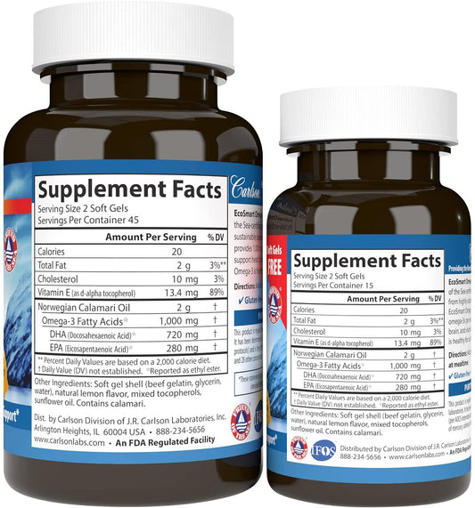Carlson - EcoSmart Omega-3, 1000 mg Omega-3s Sustainable Source, Heart Health, Brain Function and Vision Support, Lemon, 90+30 soft gels