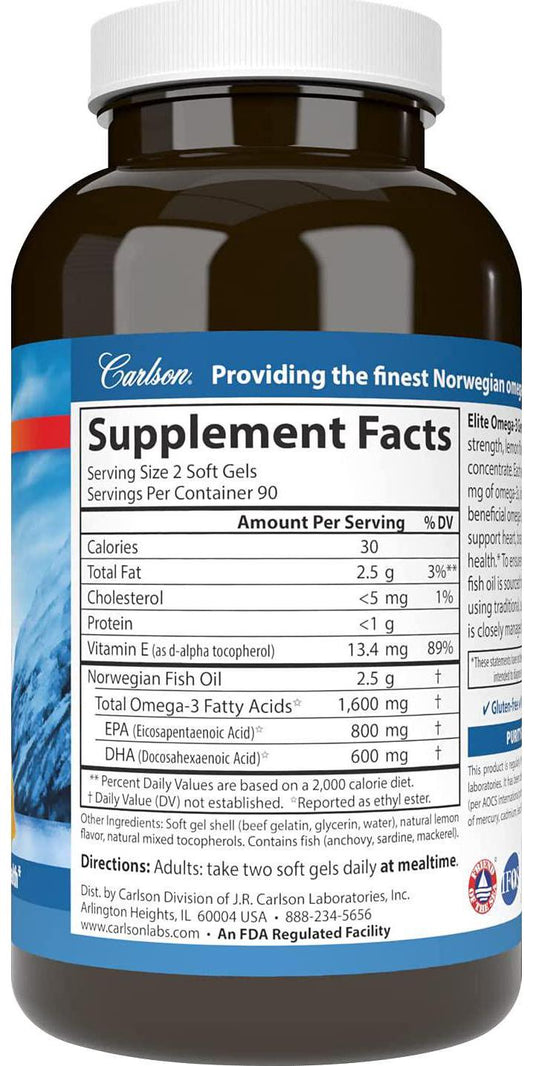 Carlson - Elite Omega-3 Gems, 1600 mg Omega-3s, Heart, Brain and Vision Support, Wild Caught, Orange, 180 soft gels