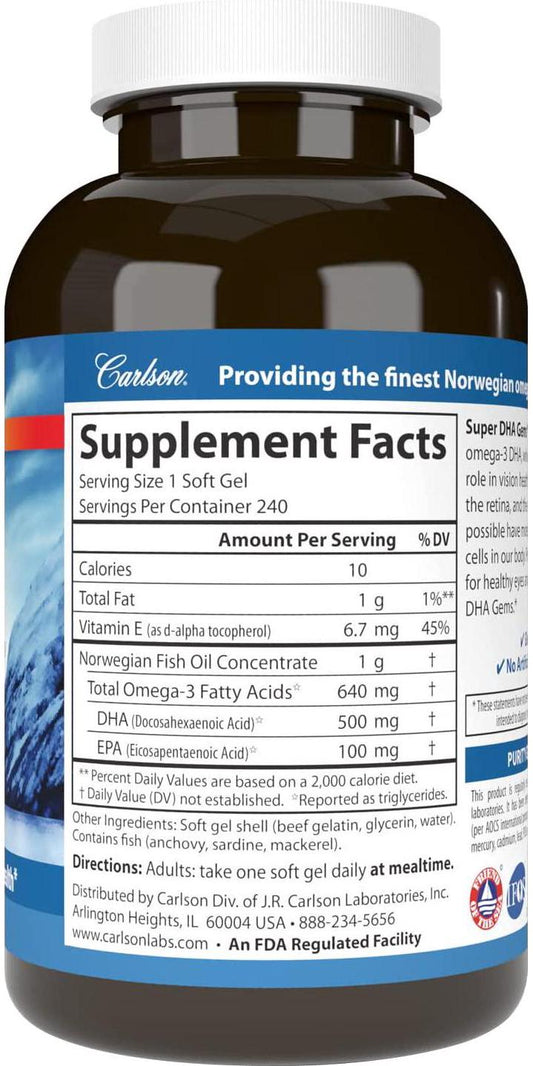 Carlson Super DHA Gems - 500 mg DHA Supplements, 640 mg Fatty Acids, Norwegian Fish Oil Concentrate, Wild-Caught, Sustainably Sourced Fish Oil Capsules, 240 Softgels